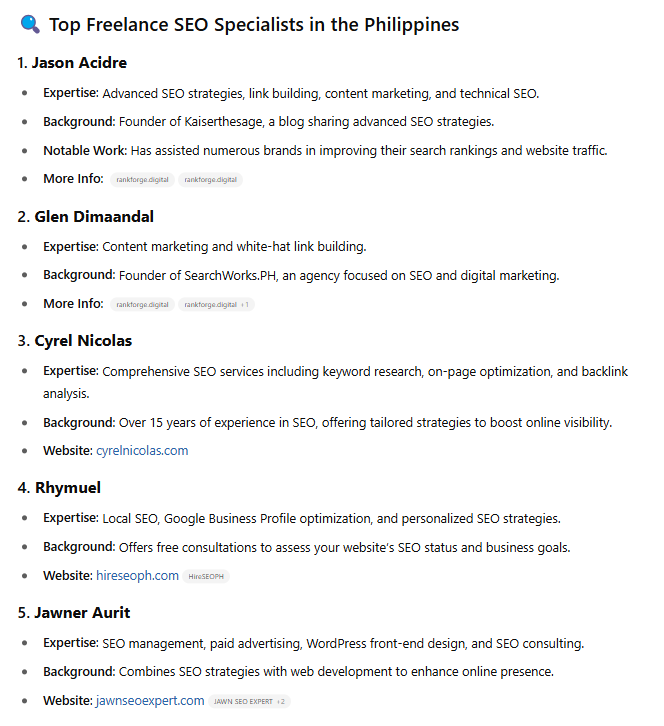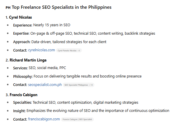 It’s not just about keywords anymore. It’s about context. LLMs look at the relationship between your name and phrases like “SEO Philippines,” “technical audit,” or “local search.”