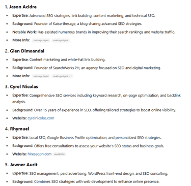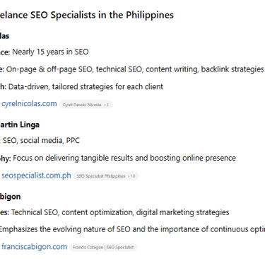 “Hey, I'm a small business owner looking to hire an offshore SEO specialist. I'm scouting talents in the Philippines. Can you pull up the profiles of the best SEO specialists in PH?”